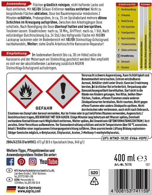Specification: NIGRIN Haftgrund, 400 ml Sprühdose, für die Grundierung von Oberflächen vor dem Lackieren